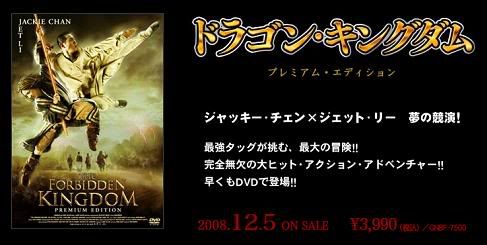 Assim como o DVD de Shaolin Girl (que já recebi na quarta-feira, obrigado), quem comprar o DVD de The Forbidden Kingdom (que no Japão foi rebatizado de The Dragon Kingdom) pelo site Amazon.jp ganha 24% de desconto, ou seja, de 3,990 ienes o preço cai pra 3,092. Obviamente o meu já está encomendado.