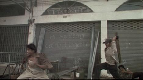 ...tem uma cena em que aparece uma pichação numa porta de ferro escrito “Hi, Spielberg. Let’s do it together”(“Oi, Spielberg. Vamos fazer isso juntos”). Não acredito que essa pichação esteja lá por acaso, senão não teria por quê aparecer assim tão claro e bem enquadrado! Só que o nome de Spielberg está grafado errado : Speilberg!! Mas já deu pra entender que o sonho de Tony é virar estrela em Hollywood, né? O máximo que ele já conseguiu fazer em Hollywood foi ser dublê de Robin Shou no filme Mortal Kombat 2.