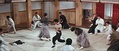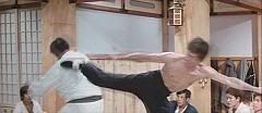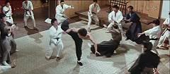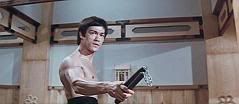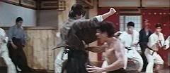 Ao levar um empurrão (é o máximo que conseguiram fazer pra atingir Bruce Lee, he, he, he) e dar uma cambalhota no chão, Bruce tira um nunchaku da cintura e continua a surrar os japoneses.