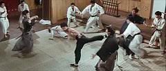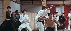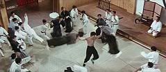 A cena em que todos os alunos fazem uma roda ao redor de Bruce Lee e este derruba todos com uma seqüência de chutes giratórios é até hoje uma das mais impressionantes do cinema mundial. A coreografia e o timing dos dublês são simplesmente PERFEITOS!!!!