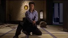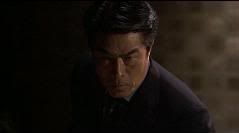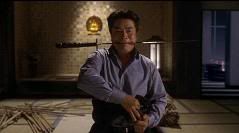 Com um belo corte na barriga, Kurata tira o paletó, amarra-o sobre o ferimento e faz uma pose típica de kendô.