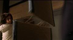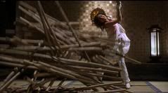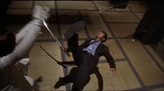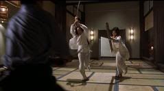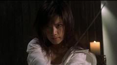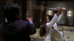 Segue-se uma seqüência linda e rápida de golpes de kataná com várias acrobacias por parte de Vicky, logicamente auxiliada por cabos e dublês.