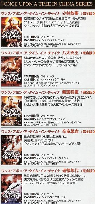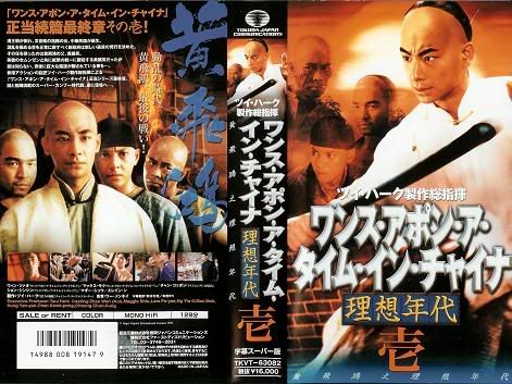 Um título em especial me chamou muito a atenção : Once Upon A Time In China, com Vincent Zhao no papel do lendário Wong Fei Hung. Achei que era uma das seqüências que foram feitas pro cinema, mas não estava conseguindo identificar se era o 4 ou o 5, e também estranhei que o filme estava dividido em duas fitas. Comprei e quando fui assistir descobri que se tratava da série de TV produzida por Tsui Hark e dirigida por Meng Hoi em 96.