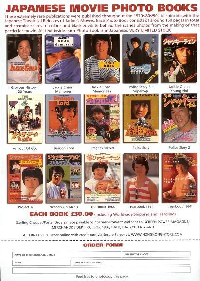 Sabem quanto eu paguei por cada livro? Apenas 350 ienes, algo em torno de US$ 3.00!!! E sabem quanto eles valem na Europa? Acreditem, 20 vezes mais!!!!! Vejam abaixo um anúncio publicado na revista inglesa Screen Power (uma revista dedicada apenas a Jackie Chan), onde eles vendem cada livro por 30 libras, que é mais ou menos US$ 60.00!!!!